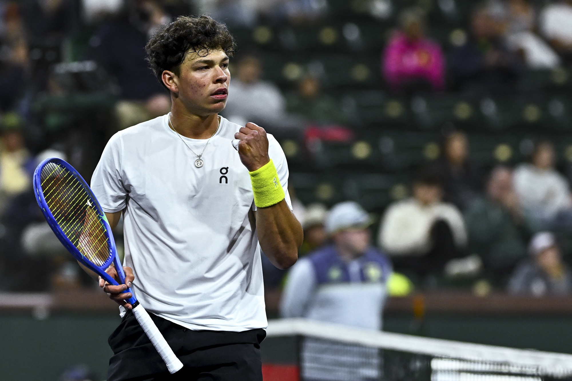 Mar 8, 2025; Indian Wells, CA, USA; Ben Shelton (USA) reacts after winning a point against Mariano Navone (ARG) at Indian Well Tennis Garden. Mandatory Credit: Jonathan Hui-Imagn Images