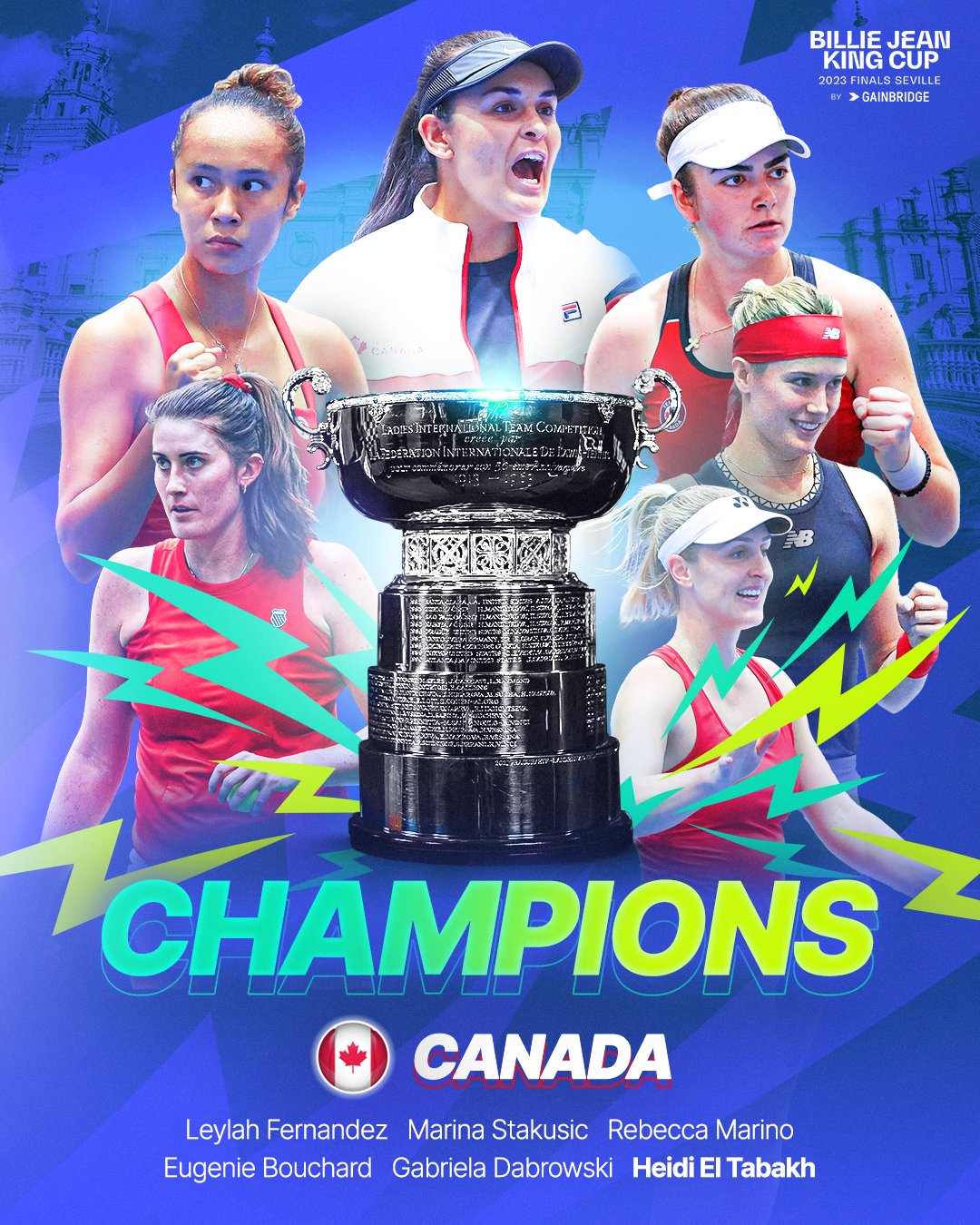 A nation can only win the gruelling Billie Jean King Cup competition if it has the best team, and that was our nation this past week,” said Michael Downey, CEO of Tennis Canada. “Canada had the best team on- court, the best support team off-court and the best team of diehard fans, many of whom travelled farther than most of the 12 competing nations to cheer their team to victory. Congratulations to all our Canadian teams, but especially the one comprised of Leylah Annie, Gabriela, Marina, Eugenie, Rebecca and captain Heidi, now holding the title of BJKC world champions!”