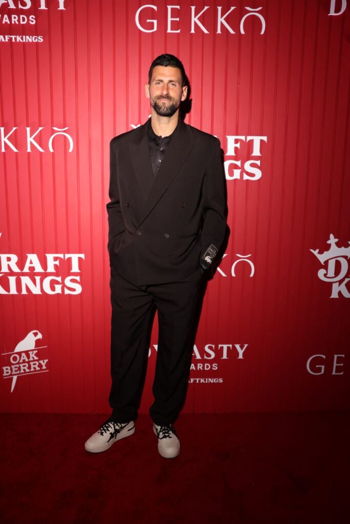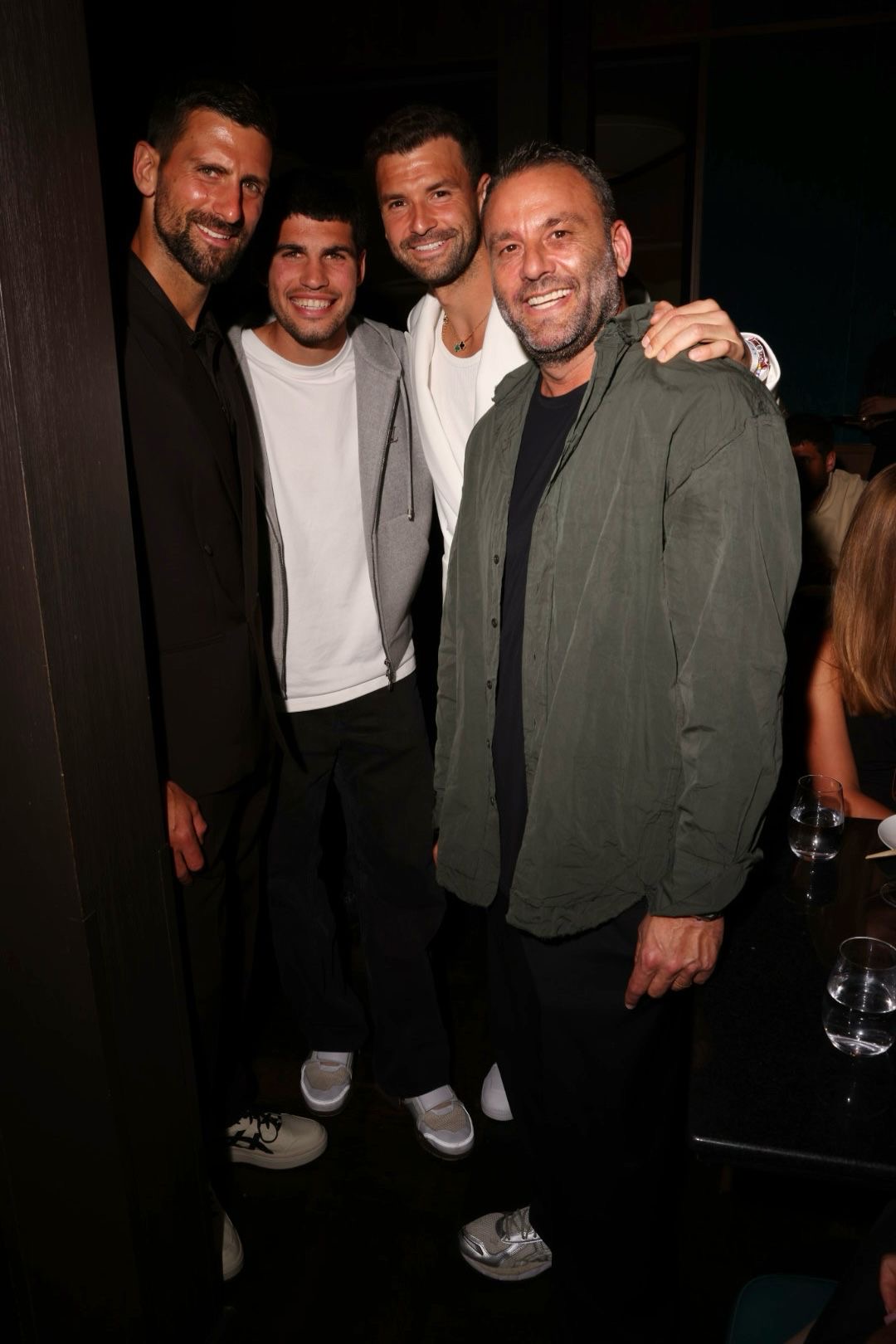 Novak arrived directly from his Lacoste event wearing a black La Chemise Lacoste suit alongside Dimitrov who was spotted in a white suit. Alcaraz arrived in a more casual look, wearing a simple gray Louis Vuitton hoodie and black jeans. Sabalenka joined her boyfriend Georgios Frangulis and friend David Grutman on the red carpet.
