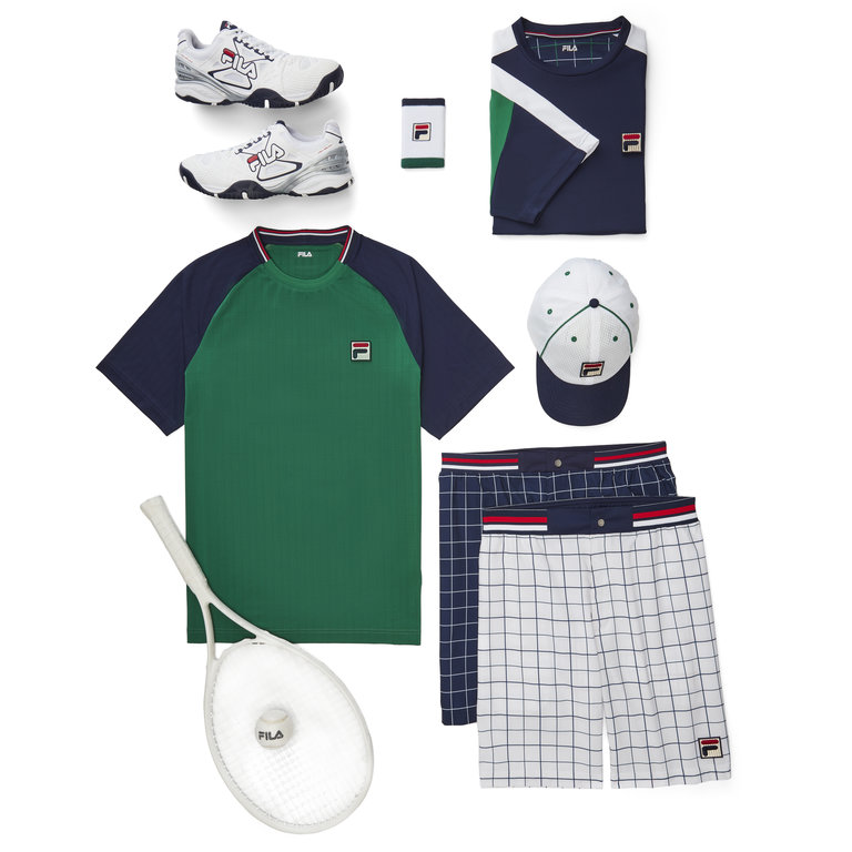 The men’s Heritage range features an array of crew neck tops, polo shirts and shorts, as well as a jacket and pant. Similar to the women’s side, this line has expanded to incorporate FILA’s heritage green hue. Additional design details include a windowpane jacquard pattern, knit-in collars and signature FILA tri-color taping. All Items are embellished with the embroidered F-Box patch logo.