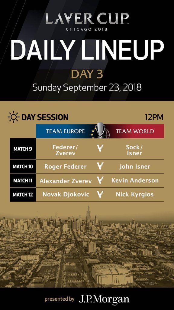 Sunday’s order of play for the Laver Cup in Chicago, U.S.A. can be found below.
