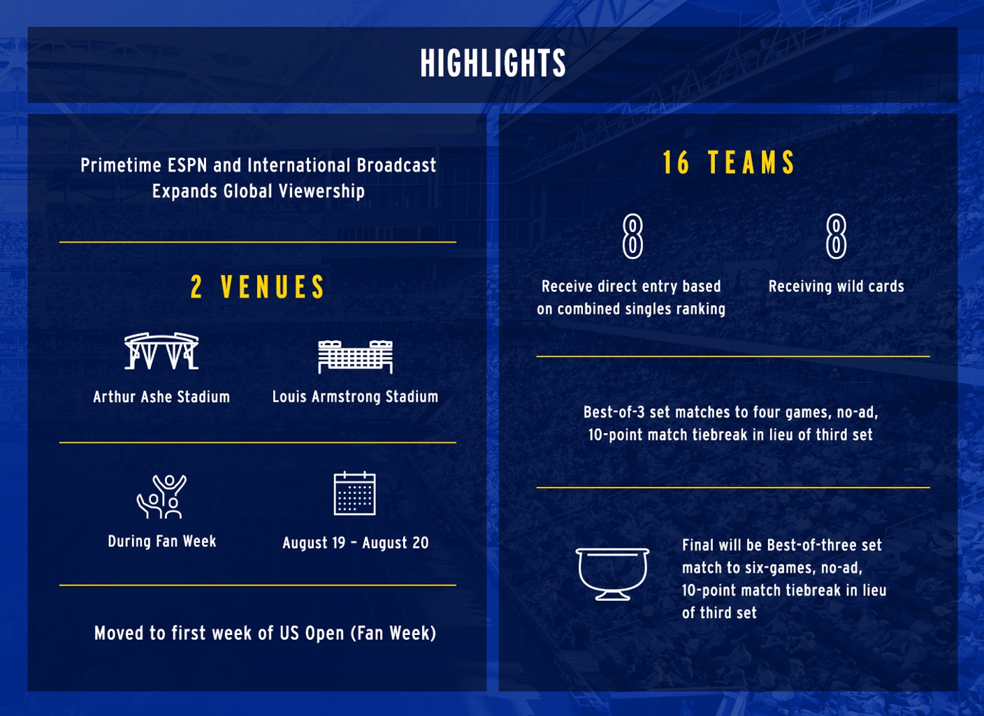 - Dedicated spotlight on mixed doubles – Previous US Open Mixed Doubles Championships have been overshadowed by simultaneous singles and doubles match play, limiting live viewership and lowering the appeal for primetime broadcasts that would otherwise reach a wider and global audience. Additionally, all matches will now be played in Arthur Ashe and Louis Armstrong Stadiums signaling the importance and priority of this exciting championship competition.