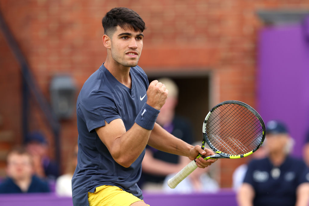 LONDON, ENGLAND - JUNE 18: Carlos Alcaraz of Spain celebrates against Francisco Cerundolo of Argentina during the Men's Singles Round of 32 match on Day Two of the cinch Championships at The Queen's Club on June 18, 2024 in London, England. (Photo by Clive Brunskill/Getty Images)