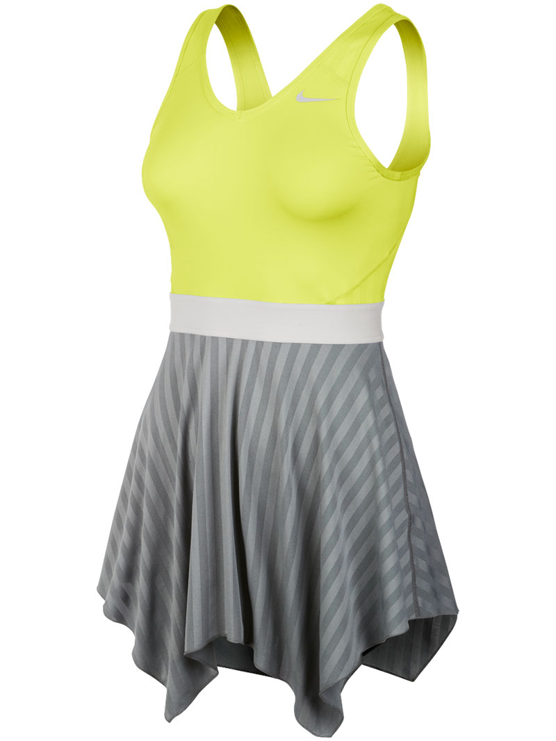 Confident as always about her chances at another grand slam title, Serena will feel her best on court in her newest Summer Serena Novelty Knit Dress in venom green with metallic iron ore and matte silver. The world No. 1’s dress will feature a scoop neck, open back, waist-defining band in a contrast color, knit jacquard skirt and a heat transfer Swoosh on left chest.