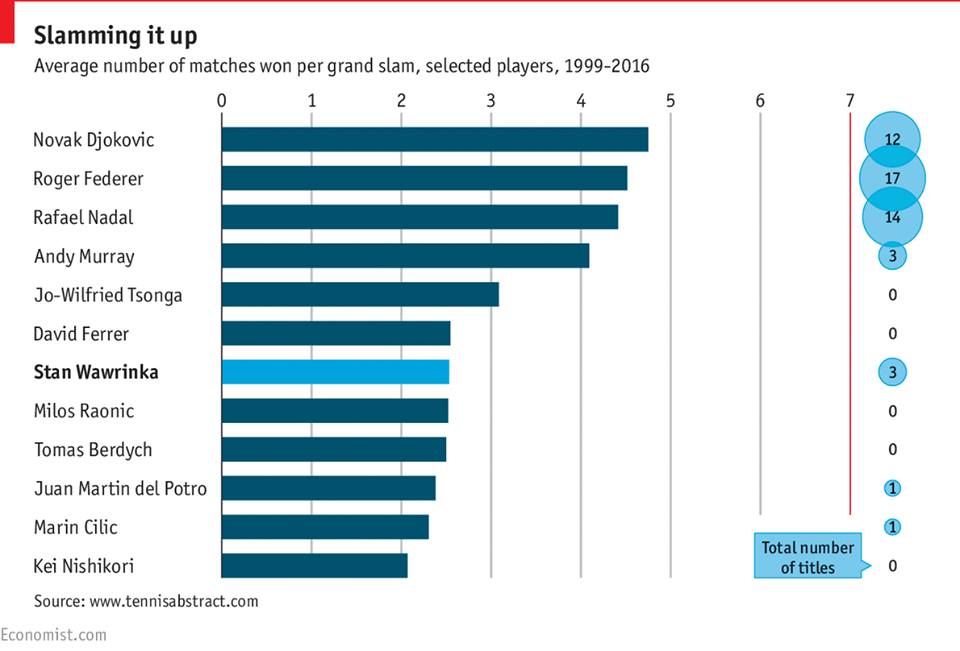 History tends to love a winner and will love Wawrinka. In the same way that Murray never quite reached the heights of Djokovic, Nadal and Federer but stood out so much above his peers, Wawrinka is not quite an Andy Murray but he’s quite a bit above Tsonga’s level. He’s won only 23 % of his matches against the Big Four, but 59% of them against Tsonga, Ferrer and Berdych.