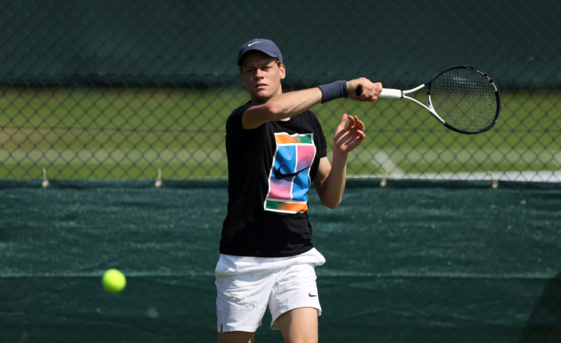 LONDON, ENGLAND - JUNE 26: Jannik Sinner of Italy plays a forehand during practice prior to The Championships Wimbledon 2024 at All England Lawn Tennis and Croquet Club on June 26, 2024 in London, England. (Photo by Clive Brunskill/Getty Images)